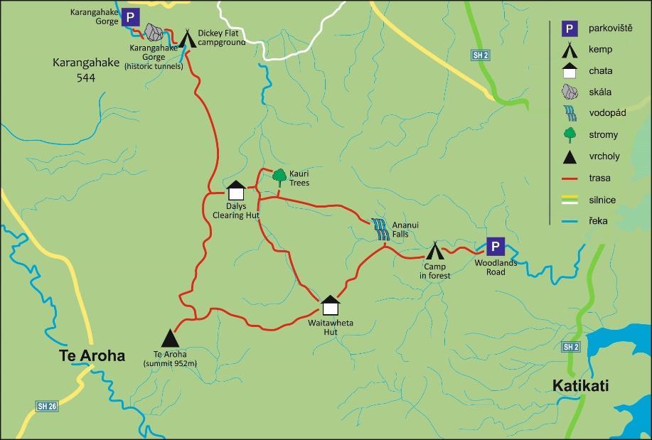 Jenutnézdůraznit,žeuvedenádobasemůželišitvzávislostina fyzických schopnostech. Určitě se nevyplatí orientovat podle ukazatelůodDOC(DepartmentofConservation)vtétooblasti. ZWaitawhetaHutvedeznačenácestaažnavrcholTeAroha Mountain.Trackodsvéhopočátkuprocházídlouhounekonečnou bušíajefyzickynáročný.Vtěchtomístechlzespatřitdivokékozy, kteréjsouvelmiplaché.KdyžturistépoprvéuvidíTeArohu,čekáje ještědevadesátiminutovývýstupnavrchol.Cestouminouodbočku