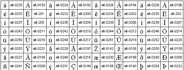 V mnoha jazycích se základní latinka doplňuje akcentovanými znaky, zde uvádíme i jejich kódy pro jejich zadávání v počítači: