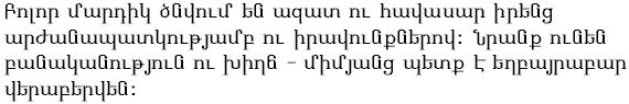 Omnes homines dignitate et iure liberi et pares nascuntur, rationis et conscientiae participes sunt, quibus inter se concordiae studio est agendum.
