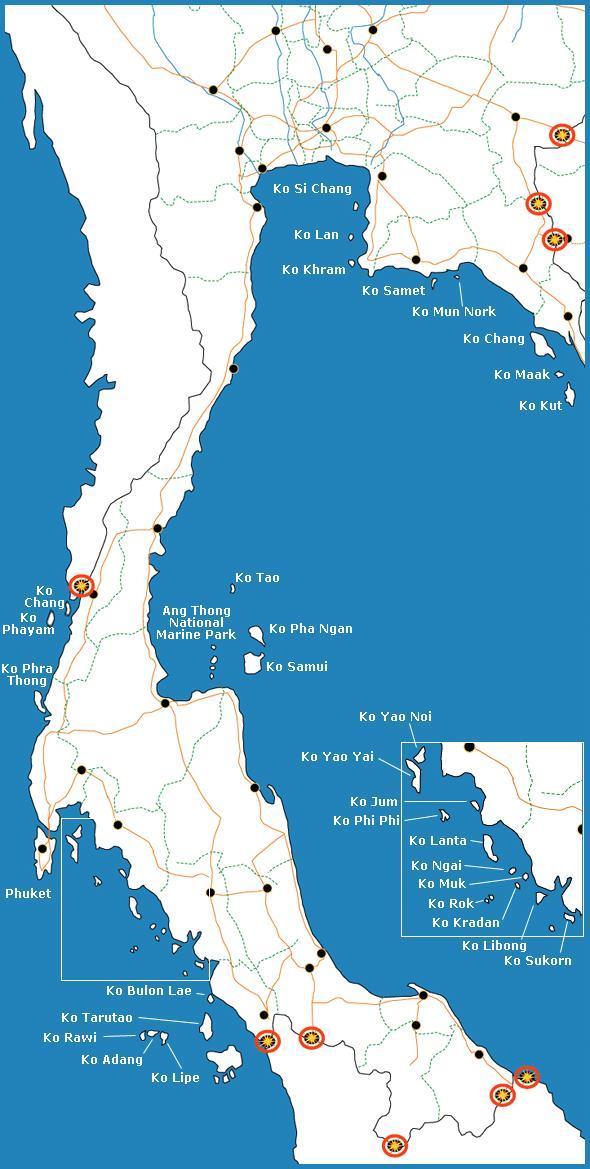 Největší skupiny ostrovů jsou oblast Phang-Nga (67 ostrovů), Národní park Mu Ko Chang (52 ostrovů), Národní Park Mu Ko Tarutao (51 ostrovů) a Národní park Mu Ko Ang Thong (42 ostrovů). Pokudsečtemejenomostrovyvtěchtočtyřechoblastech, dojdemekčíslu212ostrovů.