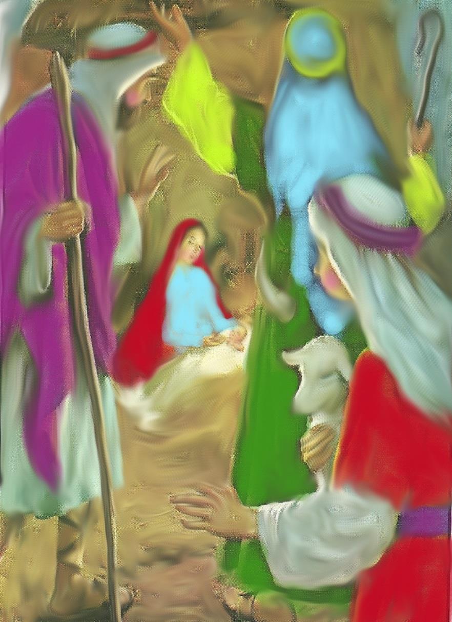 Přišli se poklonit Božímu děťátku. Nalezli v jeskyni Josefa a Marii, Boží matku, děťátko položené v jeslích, jak klidně spí, a zvířátka, jak nad ním bdí.