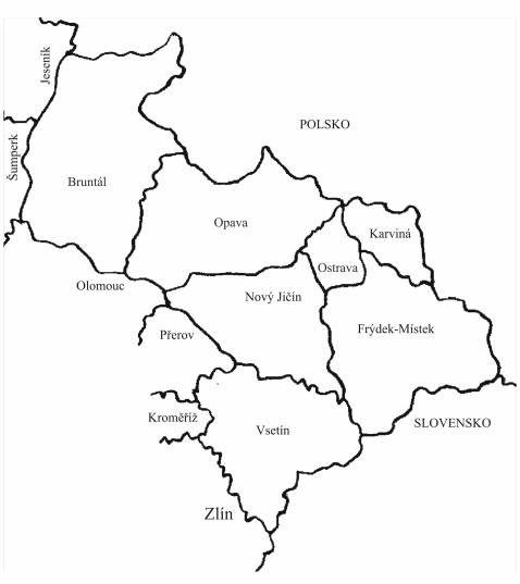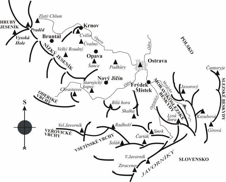 Nízký Jeseník s Bruntálskou vrchovinou. Uprostřed, od jesenické oblasti jihovýchodně, je to rozsáhlé území Moravské brány, které výrazně odděluje severnější Oderské vrchy (Nízký Jeseník) od Moravskoslezských Beskyd, tedy části Západních Beskyd, patřících již do Karpatské soustavy. Směrem k jihovýchodu sem ještě patří Štramberská vrchovina s Veřovickými vrchy a pak již hraniční hřeben Slezských Beskyd, Vsetínských vrchů a již