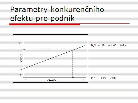 Klíčovou vazbou vymezující podmínky efektu pro podnik z podnikatelské alokace zdrojů je vazba mezi velikostí efektu a postupovaného objektivního rizika, znázorněná lineárním vztahem mezi rizikem a efektem. Tento vztah je vyjádřen na následujícím obrázku (Obrázek 7).