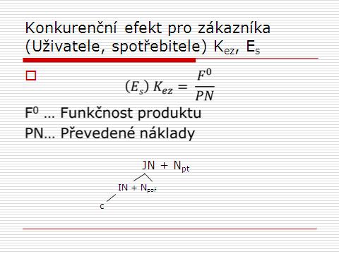 C1 je cena nového výrobku, C0 cena starého výrobku, KEz konkurenční efekt pro zákazníka, Np0 provozní náklady starého výrobku, Np1 provozní náklady nového výrobku, Q objem užití.