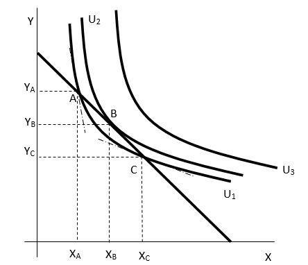 Podmínky optima jsou splněny jedině tam, kde se rozpočtové omezení a indiferenční křivka dotýkají, neboť v takové situace je jednak využit celý nominální příjem a rovněž jsou shodné sklony obou funkcí, tedy mezní míra substituce ve směně a ve spotřebě. Snadno si můžeme všimnout, že příslušným přerozdělením spotřeby mezi statky X a Y vůči spotřebním košům A a C se postupně dostaneme ke spotřebnímu koši B, který leží na vyšší hladině užitku.