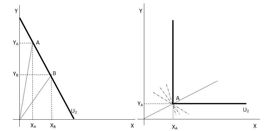 Pokud bychom tedy k množství XA přidali více statku Y než je množství YA, nutně by tento nový spotřební koš musel spotřebiteli přinést vyšší užitek; měl by stejně statku X, ale více statku Y. Stejně tak, pokud bychom k množství YA přidali více