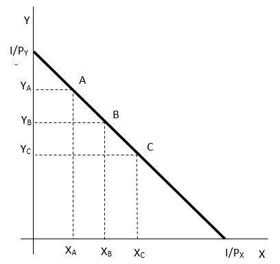 Grafickou intepretaci rozpočtového omezení odvodíme z extrémů, které jsou spotřebiteli k dispozici. Jedním z extrémů je, že by spotřebovával pouze statek Y, množství statku X by tedy bylo nulové a z rozpočtového omezení (1.7) plyne, že maximální množství statku Y, které může nakoupit, by bylo dáno podílem nominálního důchodu a ceny statku Y. Druhým extrémem je situace, ve které by spotřebovával pouze statek X.