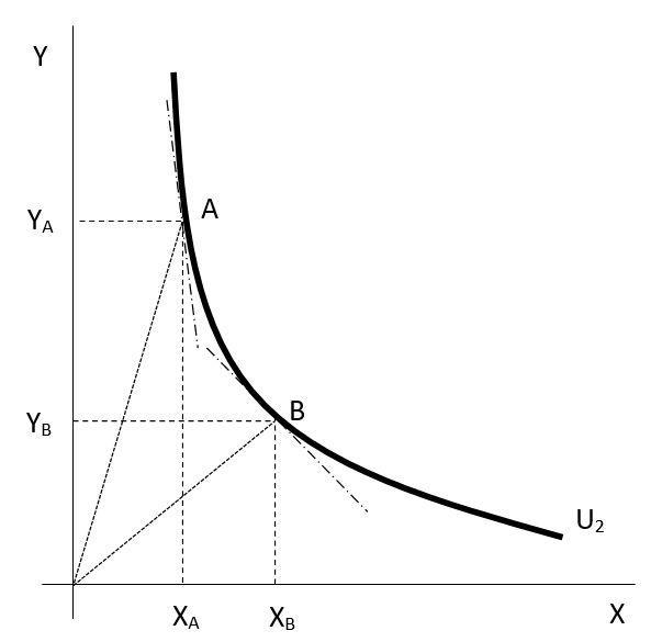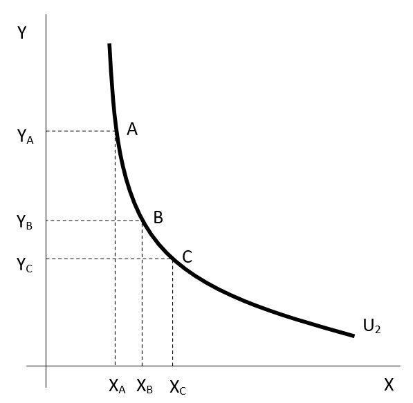 Na indiferenční křivce v obrázku 1.2 jsou zaneseny další dva spotřební koše: B a C. Snadno si lze všimnout, že přírůstek statku X mezi spotřebním košem A a B je stejný, jako jeho přírůstek mezi B a C. Na druhé straně je patrné, že úbytek statku Y mezi spotřebním košem A a B je vyšší, než jeho úbytek mezi spotřebním košem B a C. Tato skutečnost v technické rovině pouze odráží to, že indiferenční křivka není lineární, ale konvexní. Ekonomické vysvětlení souvisí s tím, že funkce mezního užitku je klesající. Pokud spotřebitel při dané výši užitku U2, zvyšuje množství statku X ve spotřebním koši, z předchozího víme, že nutně musí klesat množství statku Y ve spotřebním koši. Dále však také platí, že s tím jak konstantně zvyšuje spotřebu statku X, klesá vzácnost statku X, tedy jeho mezní užitek. Na druhé straně, s tím jak omezuje spotřebu