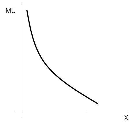 Technicky vzato to znamená, že derivace mezního užitku podle spotřebovávaného množství daného statku, jinými slovy druhá derivace funkce užitku podle množství daného statku, je záporná. Mezní užitek tedy můžeme zachytit jako klesající, avšak kladnou funkci tak, jak je vidět na obrázku 1.1.