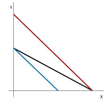 Obrázek 1.6: Pokles ceny statku Y (červeně) a růst ceny statku X (modře)