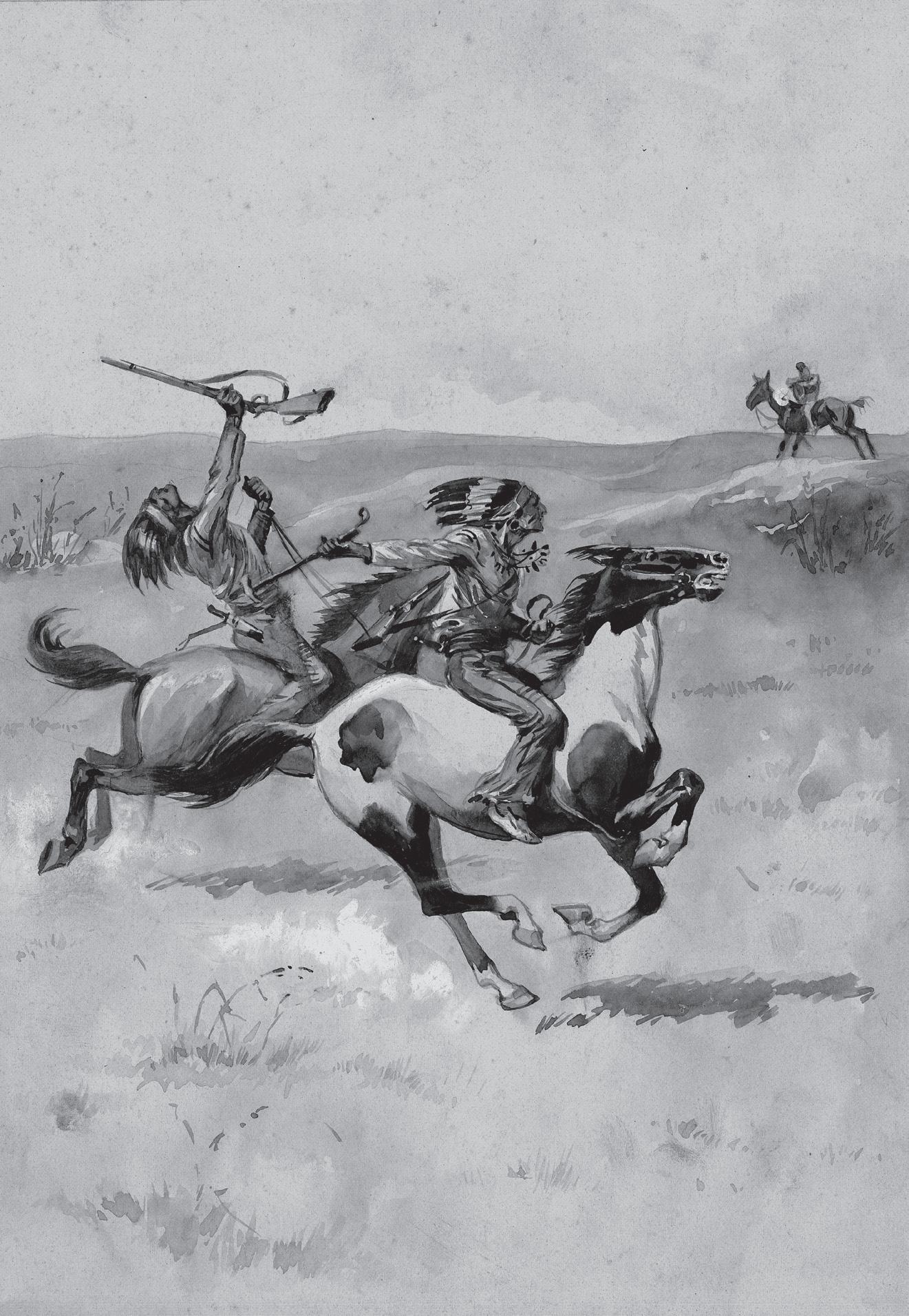 Chvíli se radili a vytvořili přitom těsný hlouček. Kulkou z medvědobijky bych je už mohl zasáhnout, ale nebylo to potřeba, neboť zrovna zahřměl výstřel a za ním druhý. Dva indiáni padli z koně, a současně zazněl hlasitý jásavý výkřik „O-hi-hi-hiii!“ Byl to onen hrdelní hlas, kterým vyrážejí indiáni svůj válečný pokřik. Ten zvuk nevycházel z indiánských úst, ale z úst malého lovce, který se přede mnou vynořil z nejbližší úžlabiny. Tvářil se, jako by chtěl zmizet. Jeho kobylka byla najednou docela jiné zvíře: zmítala nohama, až odletovaly kusy půdy, hlava se špičatýma ušima ležela hluboko v týlu a každý sval jejího těla byl napnutý. Jezdec s koněm jako by srostli. Mužík mával svou puškou a nabíjel ji v trysku s jistotou, ze které se dalo poznat, že v podobném postavení není poprvé. Za ním zapraskaly dva výstřely. Oba indiáni vystřelili, ale ani jeden z nich ho nezasáhl. Rudoši ze sebe vyrazili zuřivý řev, chopili se tomahavků a hnali se za bělochem. Ten se za nimi ještě ani neohlédl, teď už ale byl s nabíjením hotový a otočil se i s koněm. Zdálo se, jako by zvíře myslelo zároveň s ním, natáhlo se a zůstalo ztrnule stát. Jezdec přiložil pušku k líci a chvilku mířil. V příštím okamžiku se dvakrát zablesklo a oba indiáni spadli z koní. Mužova kobyla sebou při výstřelech ani nehnula.