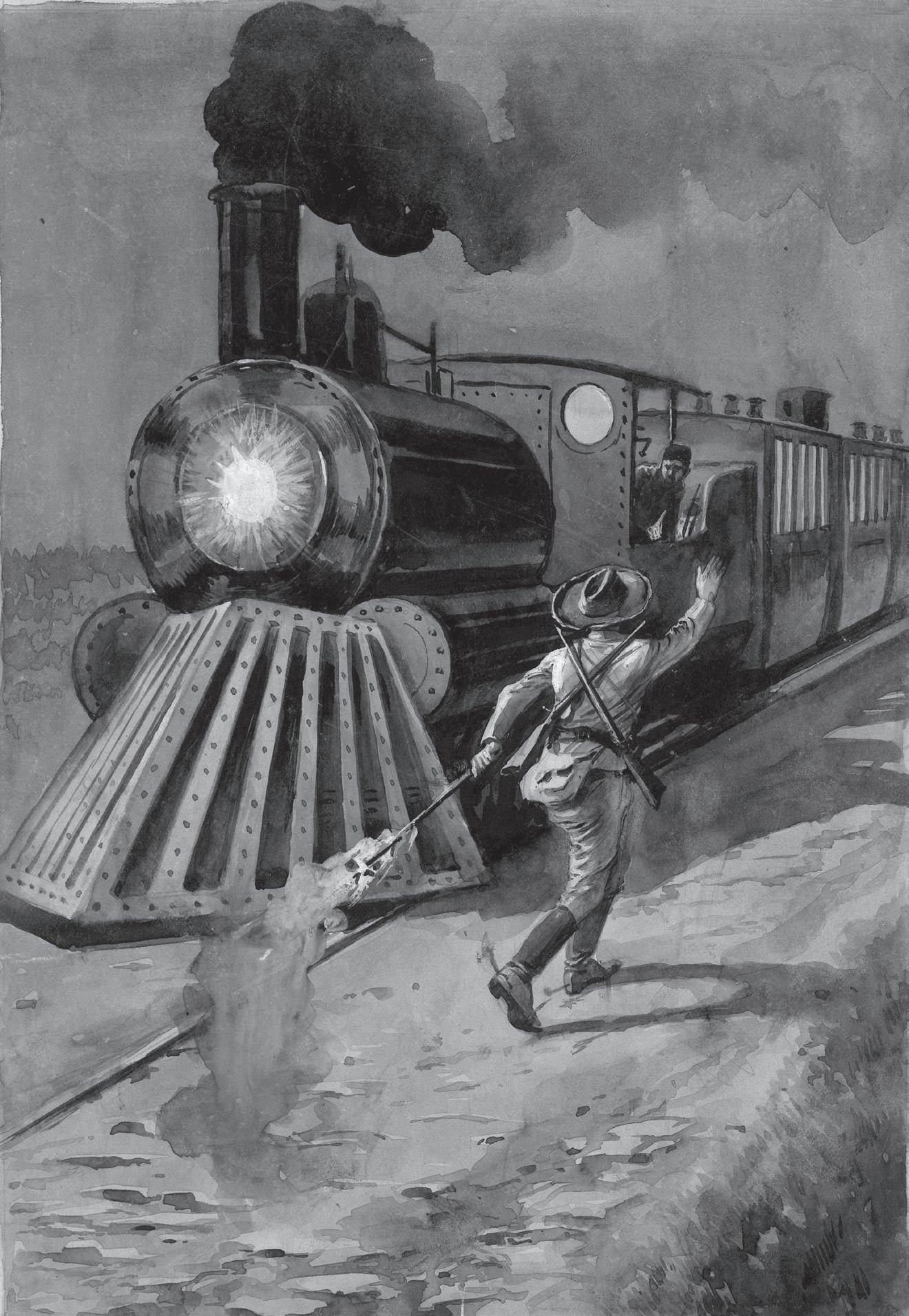 Zapálil jsem pochodeň, mával s ní nad hlavou, a běžel naproti vlaku. Strojvůdce samozřejmě zpozoroval, že mu dávám znamení k zastavení, zastavil stroj a rychle třikrát za sebou zapískal. Na kola se s skřípotem položily brzdy, ozval se sluch rozrývající hukot, rachot a syčení, a parostroj zastavil právě u místa, kde na náspu hořel můj oheň. Strojvedoucí se naklonil ke mně dolů a zeptal se: