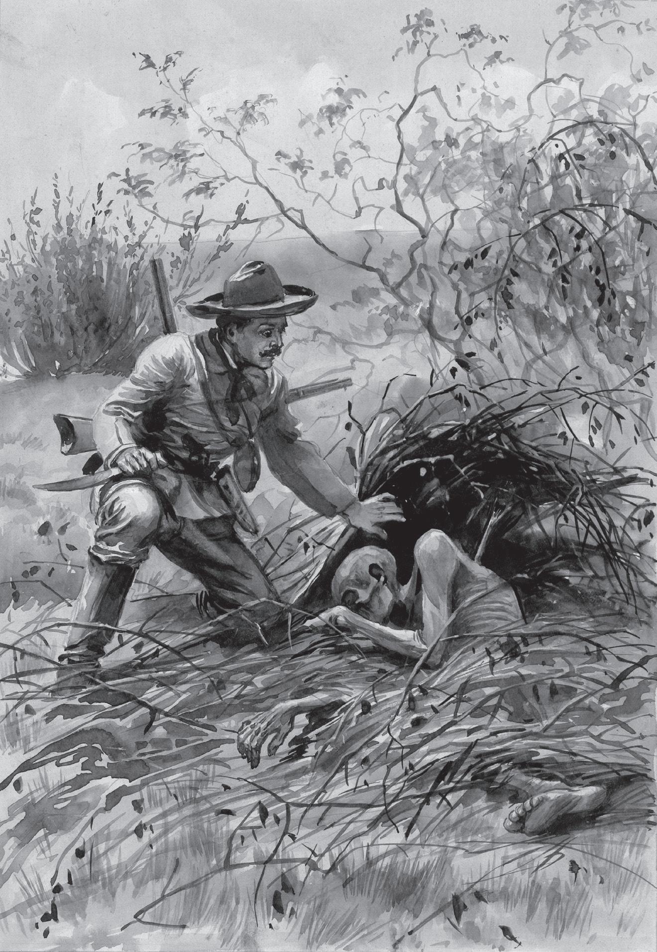 Doplížili jsme se ke koním a snadno rozpoznali postavy obou strážců, kteří se procházeli sem a tam. Jeden z nich se zvolna přibližoval ke křoví, za kterým jsme stáli. Když procházel kolem, zaleskla se na okamžik čepel Markova nože, nic víc. Jakmile se přiblížil druhý, stihl ho stejný osud. Kdo nezná prérii, nemá ani ponětí o zuřivosti, s jakou se tady potíraly dvě rasy, jejichž příslušníci se každým krokem brodili v krvi svých nepřátel.