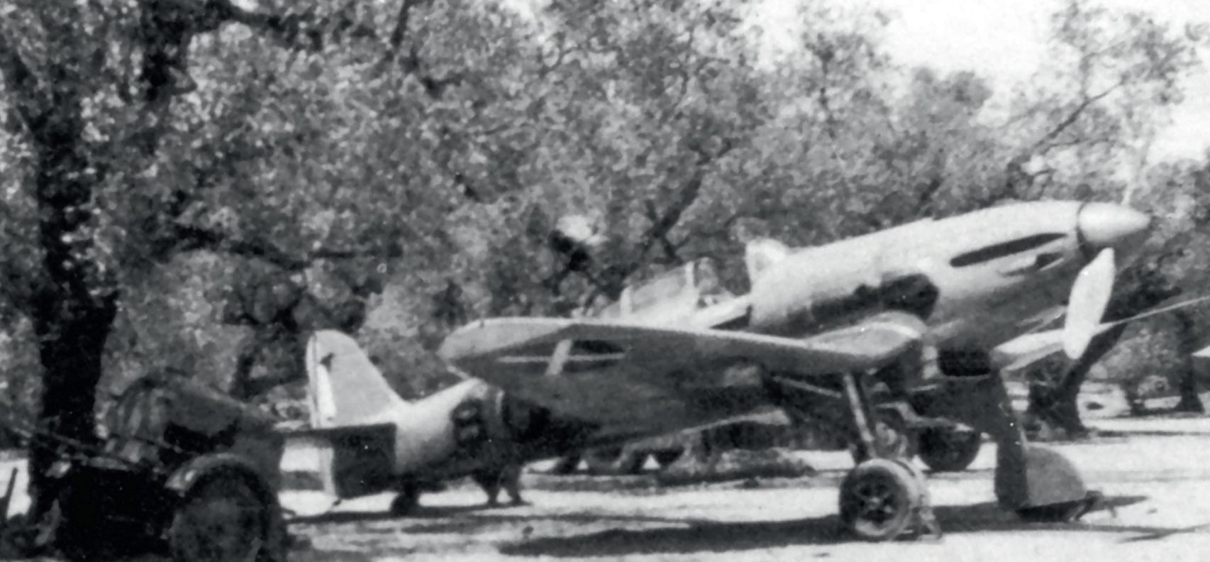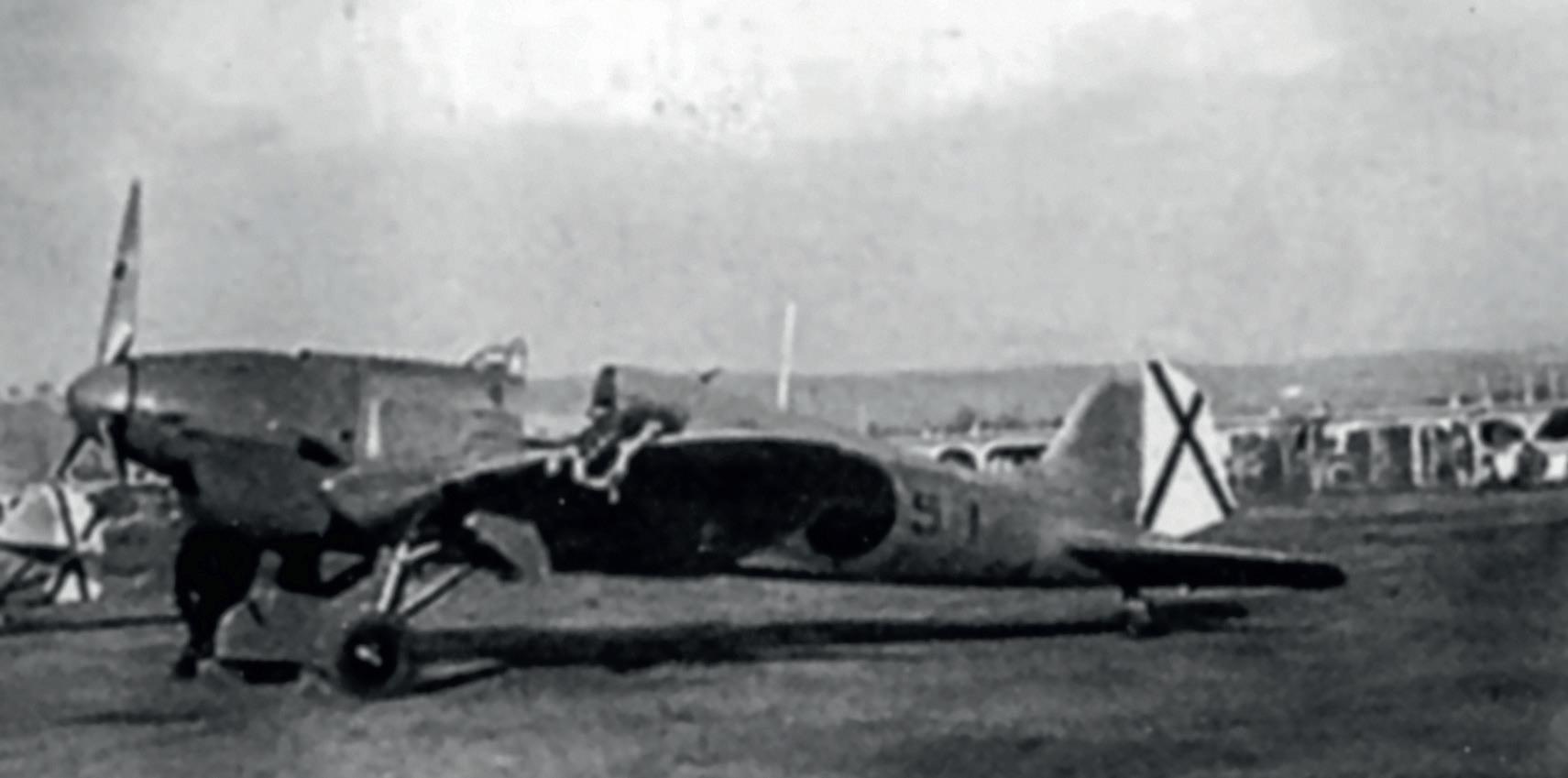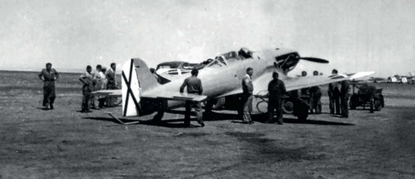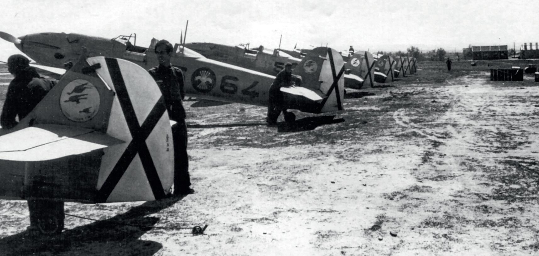 2a Escuadrilly z Grupa de Caza 5-G-5 na letišti Griñon během závěrečných fází občanské války. V popředí jsou vidět ocasní plochy Bf 109 z 1a Escuadrilly téže skupiny