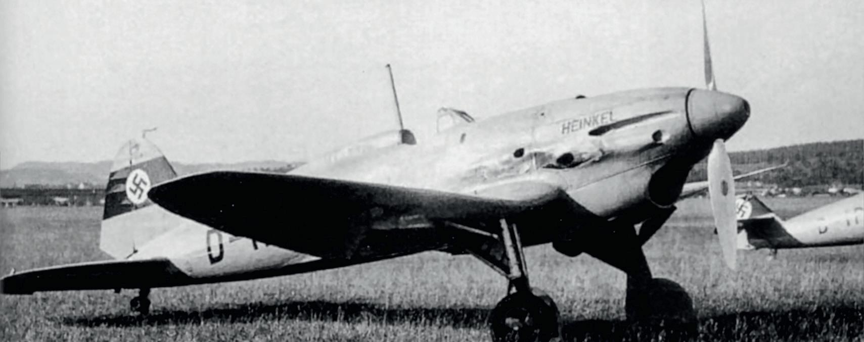 Prototyp He 112 V9 předváděný na Iberském poloostrově během roku 1938. Létal zde s ním Hauptmann Harro Harder ( hákový kříž, na letounu vepsaný do trupového černého terče, pilot používal jako svůj osobní emblém )