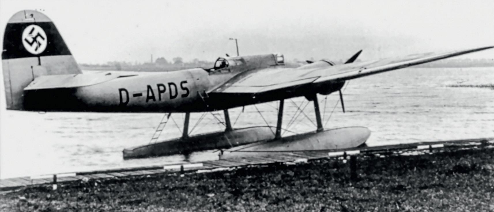 Druhý prototyp He 115 V2 ( W. Nr. 1554, D-APDS ) s odsunutým překrytem prostoru radisty. Dobře je vidět původní provedení vzpěr plováků, objevující se u prototypů