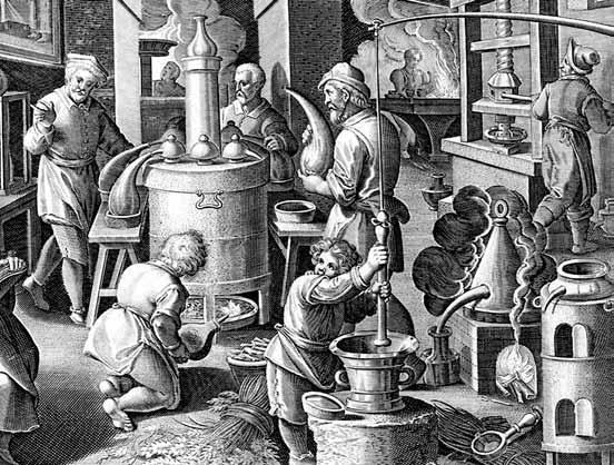 Pohled do alchymistické laboratoře v 16. století na dobové rytině