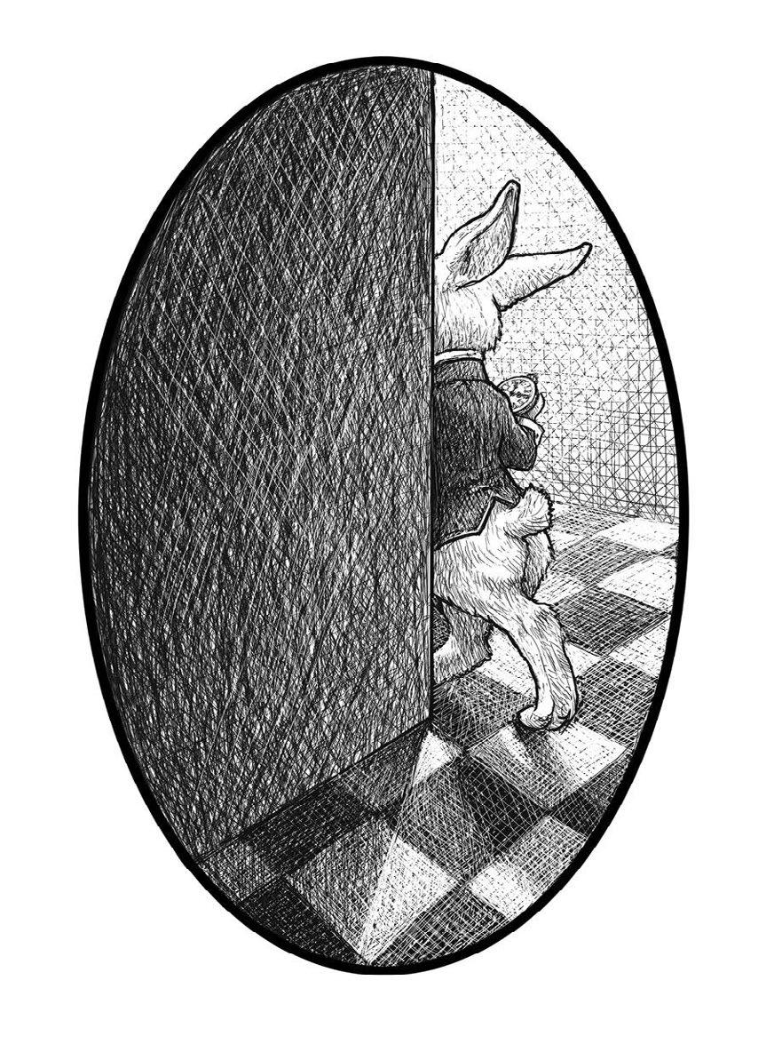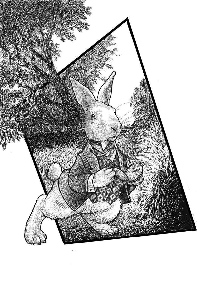 Alice wondered. She was still sitting and thinking when suddenly a White Rabbit with pink eyes ran past her.