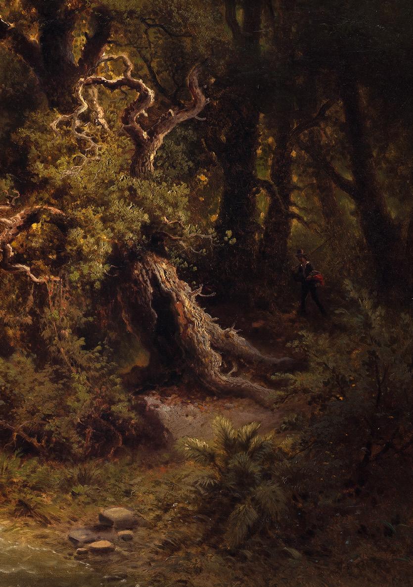 Zrovna naproti nim stál dřevěný kříž a podle něho vedla ouzká skalnatá pěšina na kopec. Nad ní, vzhůru do kopce, vlálo husté liskové křoví; pod ní byla hluboká kolmá hráz, tím hlubší a hlubší, čím výše po hoře vedla. Po příkré straně bylo silné, zde onde již přerážené zábradlí, za nímž na některých místech jednotlivé trní zakvítalo. Hlouběji šeřily se vrchole jedlí, ostatní jich dílové tratili se v mlze.