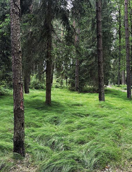 Všimli jste si, jak v nízkém slunci zazáří červené odstíny? Zde zastoupeny kůrou vzrostlých borovic. Krásná v ranním nebo večerním slunci jsou ale i načervenalá stébla některých travin nebo třeba pruty rudých kultivarů svíd. Zkuste na to myslet při komponování pohledových míst ve vlastní zahradě.