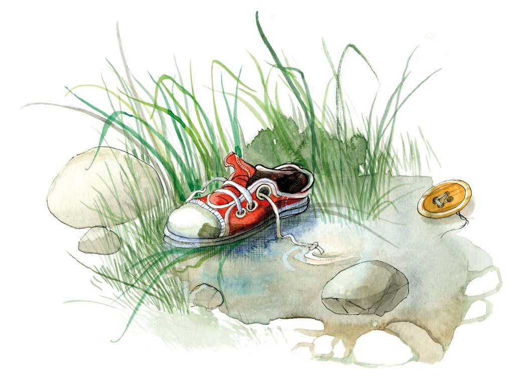 Karlík rychle vyškubl, co babička chtěla, a podal jí to do okna, aby si náhodou nevšimla pošlapaného záhonku. Když zmizela, znovu zadumaně prohlížel podupanou zem. Dvorek byl u vchodu vydlážděný, ale zbytek pokrývala tráva s ostrůvky hlíny, teď plnými kaluží. Jestli někdo poskakoval pod okny, nemohl přece spadnout z nebe! Odkud přiběhl? Karlík se rozhlédl. Jedině z lesa! Po trávníku vedly vyšlapané cestičky ke kůlně a ke garáži. Na konci zahrady stál dřevěný plaňkový plot. Karlík sledoval stopy s nosem u země. A... co je tohle? Vylovil z kaluže cosi malého a zabláceného. Visely z toho jakési provázky? Oh! Tkaničky...? Pane jo! Malá teniska, sešlapaná na patě zrovna jako ta jeho!