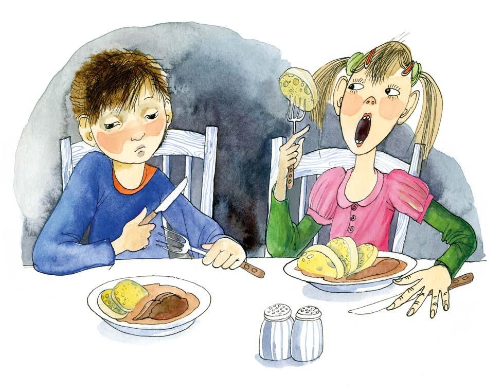 „To tak!“ pousmála se babička. „Tam děti vracejí plné talíře jídla, které se pak hází do kýble! To bych se zbláznila. Nesnáším plýtvání! A ty, Karlíku, jez pořádně. Vezmi si příklad z Týnky! Podívej, jak roste. Už je větší než já.“