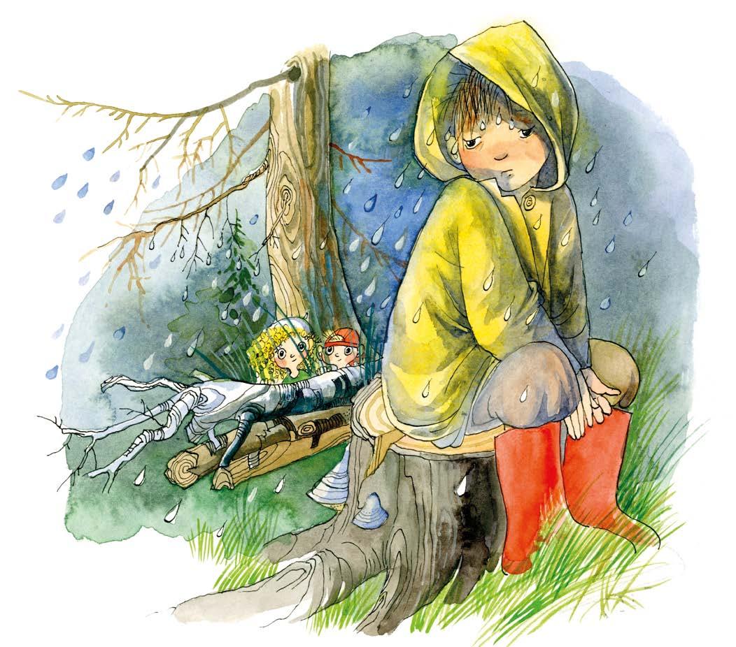 „Prší,“ prohodila babička s pohledem do okna, „smůla. Chtěla jsem vás vzít do lesa. Ale jen ať lije, zahrada potřebuje pořádně zalít.“