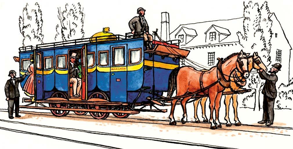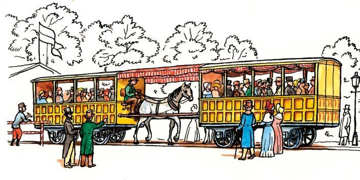 První vozy pražské koňské tramvaje. Zelený vůz vlevo vyrobila firma Ringhoffer na Smíchově v roce 1876 a druhý červený vůz dovezl podnikatel Otlet na zahájení provozu v roce 1875