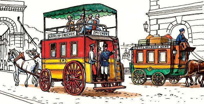 později 20 vozů. Ty za jeden den vykonaly až 26 jízd. V letech 1872–1883 působila na stejných trasách konkurenční „První pražská společnost pro omnibusy“, která měla nejprve 6 vozů, později 19 vozů. V roce 1873 zavedla předplatní lístky na 100 jízd za tři a půl zlatky. Za den přepravila až 2 700 cestujících. V Praze jezdil i patrový omnibus, s otevřeným horním patrem.
