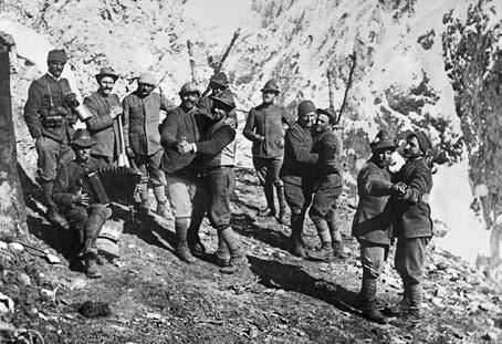 Italská fronta byla jednou z hlavních frontových linií první světové války. Italští vojáci na fotografii tančí na horské základně v Alpách za doprovodu harmoniky.