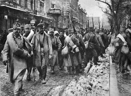 Rakousko-uherští váleční zajatci pochodují v roce 1915 Haličí obsazenou ruskými jednotkami.