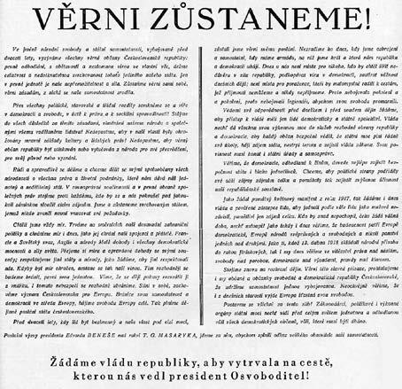 Reakcí na tyto německé (a sudetoněmecké) akce byl mimo jiné právě i manifest „Věrni zůstaneme“, který se objevil v některých novinách 15. května 1938. Nejen názvem, ale i textem se odvolával právě na slova Edvarda Beneše vyřčená nad rakví TGM. Text apeloval na sounáležitost, na upřímné navázání na ideje, ideály a úsilí, díky kterým Československo nabylo své samostatnosti. Manifest vyzýval, aby lidé v zájmu zachování samostatnosti Československa a jeho zřízení překročili třídní i politické rozdíly. Právě zřízení našeho státu totiž umožňovalo svobodu smýšlení, demokracii a svobodu jako takovou.