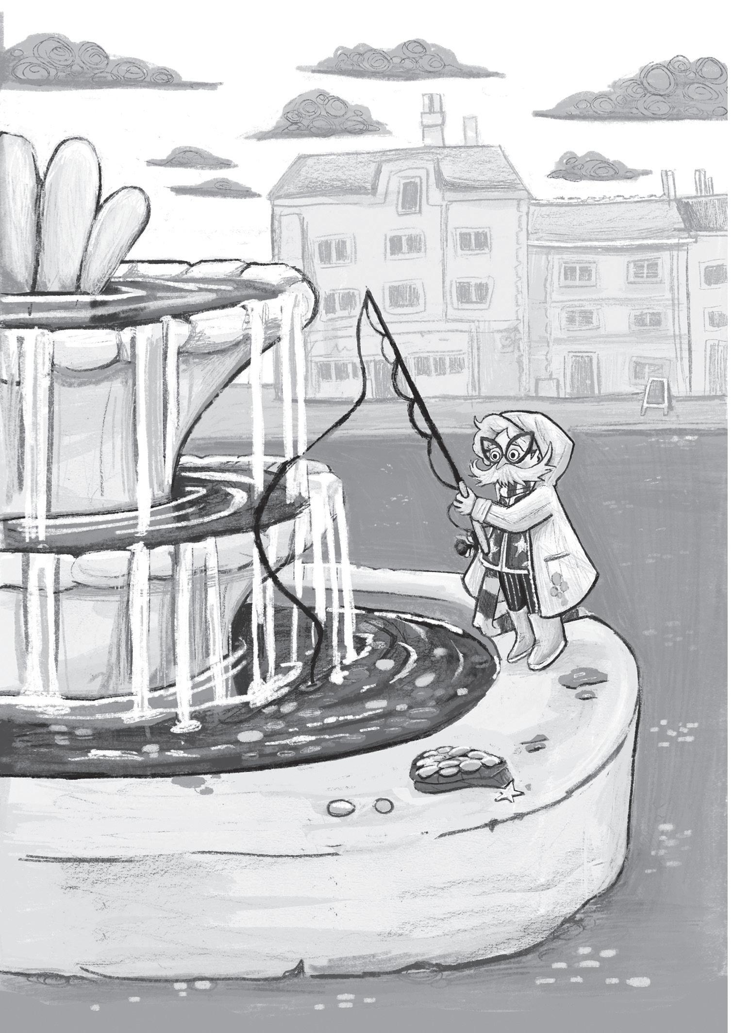 fontány stál malý mužíček. Ešte pred pár minútami tam nebol. K Félixovi bol obrátený chrbtom, hrbil sa nad vodou a v rukách zvieral čosi, čo vyzeralo ako dlhý rybársky prút. Vedľa neho bol položený fialový