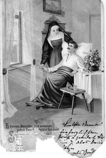 Jednoho letního dne roku 1917 obdrží babička kýčovitě pestrou pohlednici s budapešťským razítkem. Na obrázku je zraněný voják v lazaretní posteli (už zase dokáže vzpřímeně sedět) a mateřská řádová sestra s červenými tvářemi mu svírá ruku a říká, co je zapsáno kudrlinkovým rukopisem: Lidé tě mohou opustit / Bůh tě však neopustí!