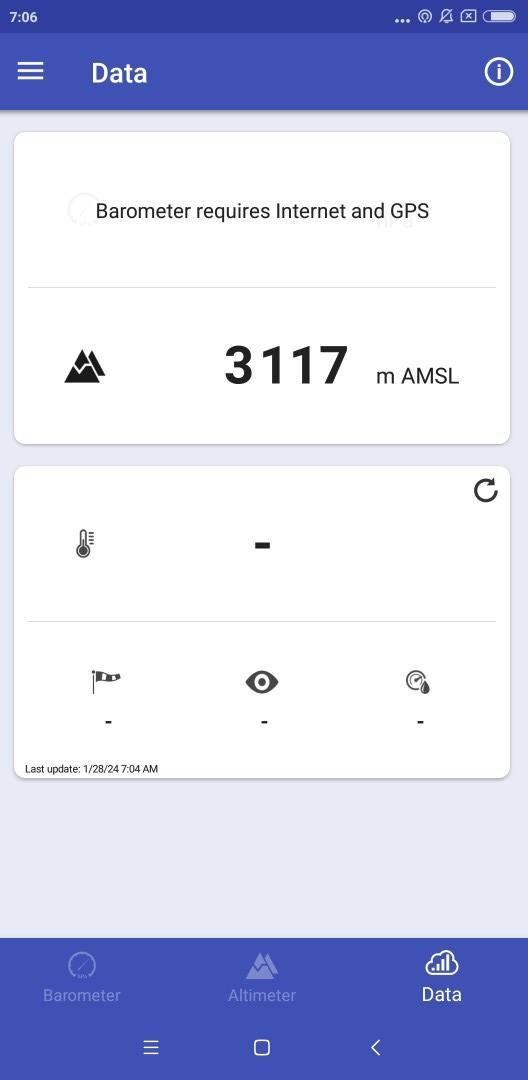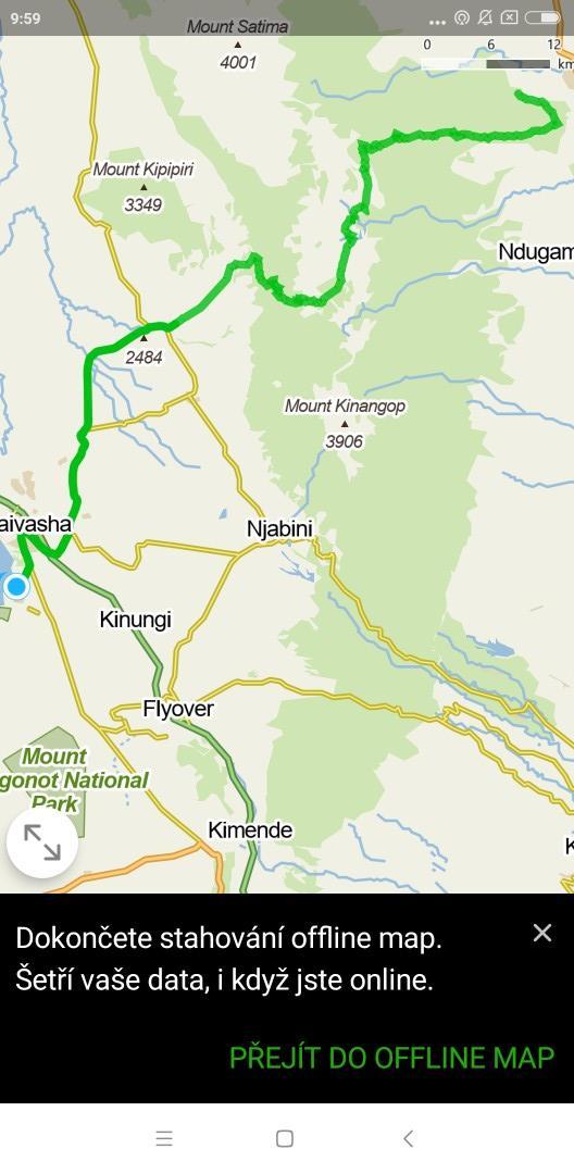 Skeny praktických offline aplikací - barometr s dosaženou nadmořskou výškou a Mapy.cz, spuštěná funkce „stopař“, zaznamenávající trasu