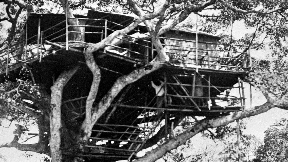 Právě v tomto Treetops hotelu, tedy hotelu v koruně 300 let starého fíkovníku, pobývala Alžběta před návratem do Sagana Lodge, kde přečetla zprávu o smrti otce