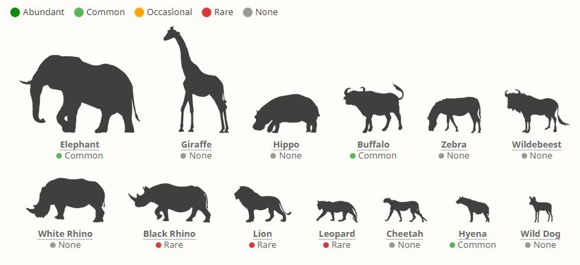 Rozhodnězdenenarazíteaninaelegantníkrálovnypouštěžirafy,aninazavalité tlustokožcehrochy,stejnějakonajinakvAmboselineboMasaiMaraběžné pakoně,jakdokladujeitabulkasvýskytemoblíbenýchdruhů.Abundantznačí hojnývýskyt,commonběžný,ocassionalobčasný,rarevzácný-tojeopravdu jenvelkýzázrakuspětanoneserovnásabsolutníjistotounule,pokuddanézvíře neutekloněkdezcirkusu.