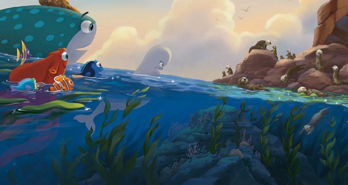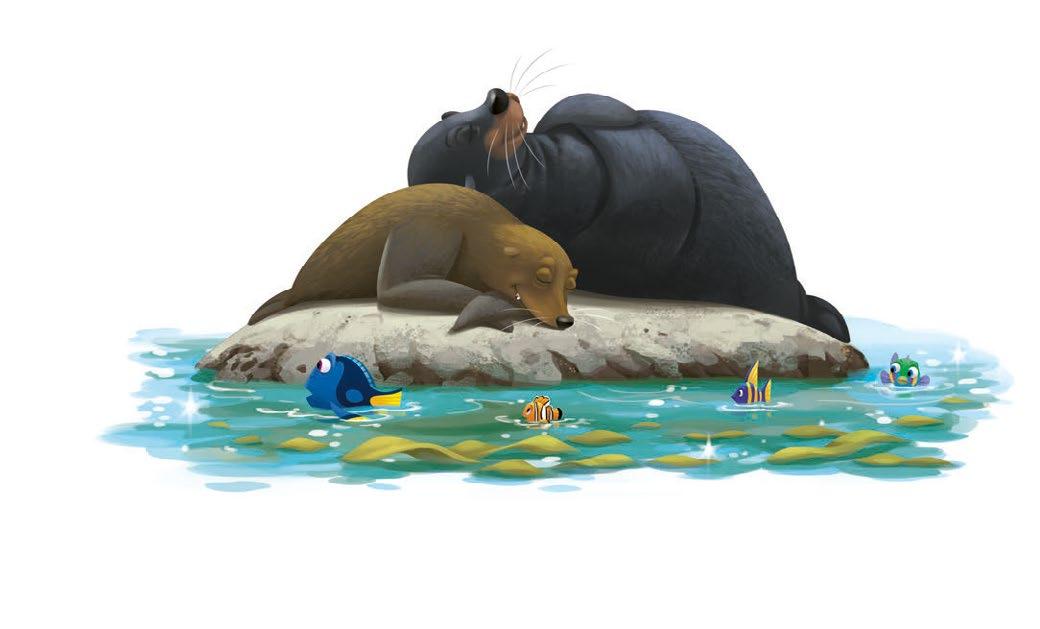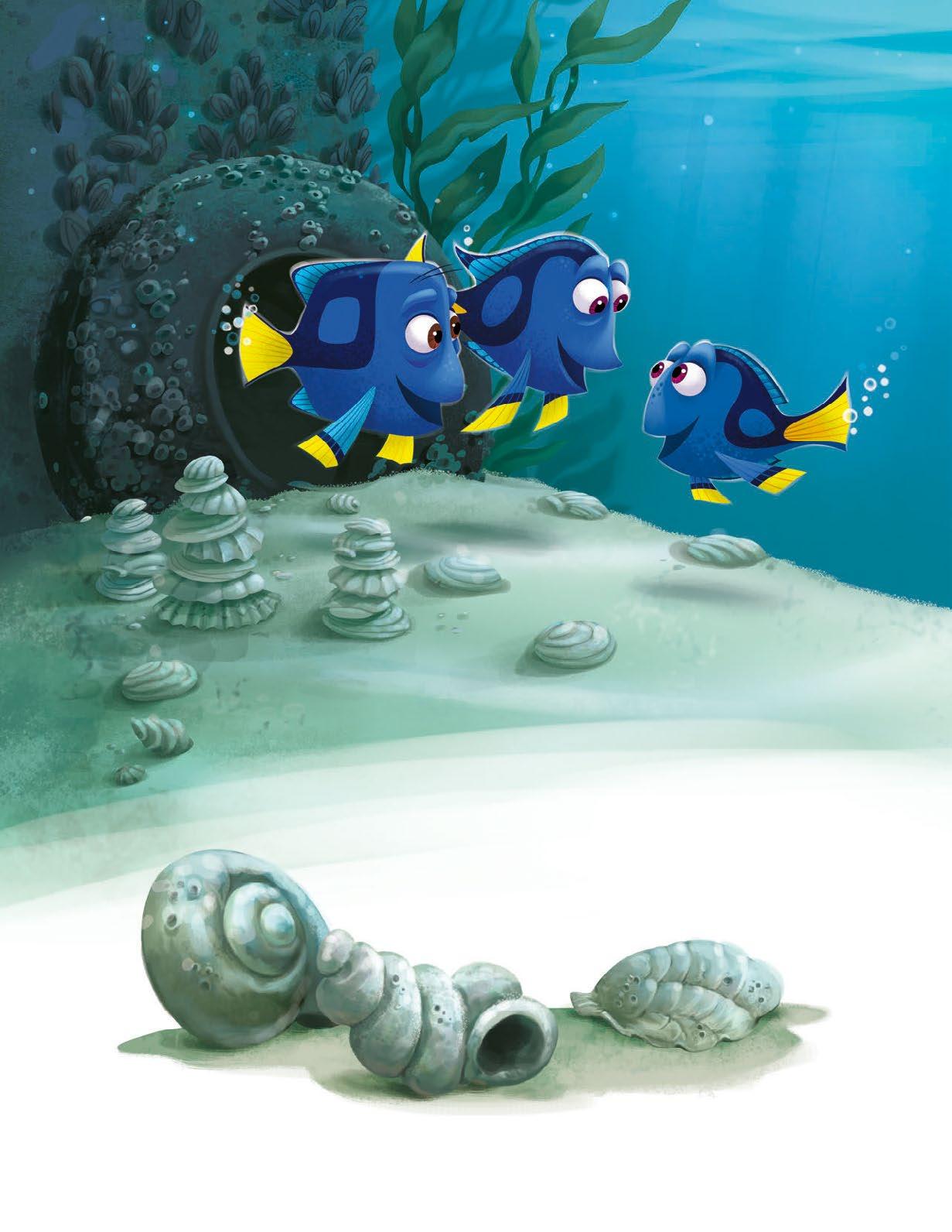 „Môžeš sa na mňa spoľahnúť,“ povedala Dory a vyštartovala ako strela hľadať vydrie mláďa. Nemo a ostatní trielili za ňou. Preplávali popod červenú bóju a okolo veľkej sivej skaly.