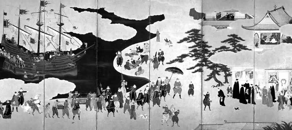 připlul jeden ze zakladatelů jezuitského řádu František Xaverský, který zde zahájil misionářskou činnost.108 Díky tomu, že Portugalci poskytovali obchodní výhody těm feudálním pánům, kteří byli jejich náboženským aktivitám nakloněni, dokázalo křesťanství v Japonsku postupně zakořenit. Z pouhých 500 konvertitů, které jezuité zaznamenali roku 1554, se nová náboženská komunita do konce sedmdesátých let 16. století rozrostla na zhruba 150 000 členů.109 Zprávy misionářů popisovaly Japonsko jako zemi křesťanství zaslíbenou a hovořily o tom, že „Japonci jsou nejvíce nakloněni k přijetí naší víry ze všech lidí na světě. Jsou prozíraví a ovládáni rozumem tak jako nebo ještě více než Španělé“.110 Roku 1569 povolil christianizovaný daimjó Ómura Sumitada Portugalcům zřídit svou základnu v Nagasaki, která se po roce 1571 stala klíčovým přístavem japonského mezinárodního obchodu, který de facto plně spravovali cizinci.111 Díky tomu, že roku 1557 získali Portugalci obchodní práva v Macau, stali se v podstatě nepostradatelnými prostředníky v obchodu s Čínou, která Japoncům uzavřela své přístavy.112 Do Japonska tak z kontinentu dováželi především hedvábí, porcelán a léčiva. Jejich obchodní artikly představovaly též cukr, exotické evropské výrobky, zbraně, olovo a střelný prach.113 Japonsko toto zboží směňovalo za stříbro, jehož se stalo předním světovým producentem.114 Pro obě strany to bylo výhodné a v podstatě nutné uspořádání. Japonci získávali nedostatkové zboží z Číny a jihovýchodní