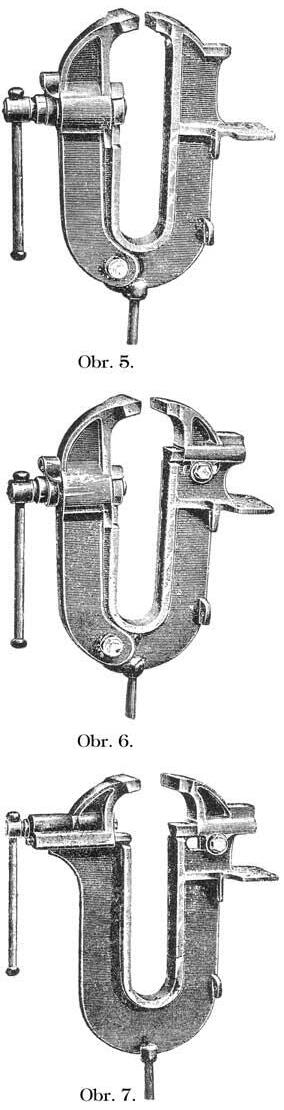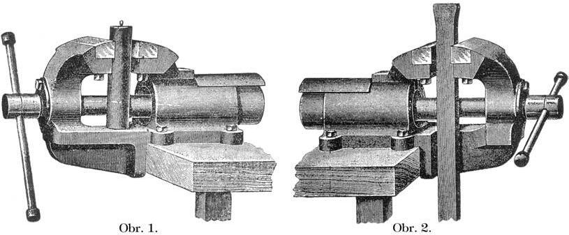 Svěrákůprohlubokézapnutívnašichdílnách dosudpostrádáme,ačzejménavdílnách,kdevyrá− bějíseplechovévěci,jestneocenitelnoupomůckou. VNěmeckuvyrábějísenejnovějipodobnésvěráky anacházejíhojnéhoupotřebení.Obr.5.,6.a7.uka zují3různédruhypodobnýchsvěráků.Jsoutopa tentovanévýrobkyfirmySchmidtaHerkenrath vBerlíně.Obr.5.model A hodíseprolehčípráce, proplechyapod.věci.Zadníčástjehojestpevná ahybnýpřístrojukrytjestvčástipřední.Rozepnutí čelistijestasi5 cm, hloubkazapnutí55 cm. Obr.6. model B jesttentýžsvěrákpropředmětytěžšíašir− ší;rozpnutíčelistíšroubemjestsicestejné,aleza pnutíširšíchpředmětůumožňujepohybzadníče listisvěráku,kterápohybujesevrybiněapomocí šroubudásenalibovolnémmístěpřitáhnouti.Obr. 7.model C jestrovnoběžnýsvěrákprohlubokéza pnutí; posouvati se dají obě čelisti přední i zadní. Veškerésvěrákymajíbýtipevněpřidělányku stolu;jsou−lišpatněpřipevněny,trpíveliceotřesy