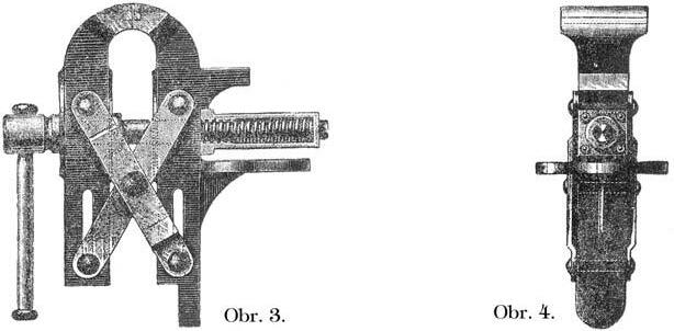 Jiný,rovněžpraktickysestrojenýrovnoběžnýsvě− rákjestdiagonálnísvěrákFröhlichův»Kolumbus«. Obr.3.a4.představujenámtentosvěráksestrany azezadu.Svěráktentovyznačujesedůmyslnou konstrukcí,kterápoužitímdvojitýchdiagonáldo volujeivmenšímsvěrákuzapnoutisebetěžšíkusy, anižbybyloobávatise,žesešroubynebočelisti zlomí.Síla,kterouvečtyřechpohyblivýchbodech diagonálpřitahovánímšroubuvyvíjíme,soustřeďu− jesevčelistíchsvěráku,jehožzadníčástjestpevna arovnásevždyúplněsíleprimárnípůsobícínače− listi.Tímzpůsobemrozdělujesetlaknačelistiana spodnídvabodydiagonályazamezujetakzlomení čelisti.Výhodouutohotosvěrákujest,žemožno jímrychleapohodlnězacházeti,rovněžito,že nenípřizapínánítěžšíchpředmětůzapotřebítako− vé námahy jako u svěráků obyčejných.