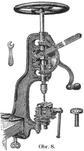 Zestrojůpomocných,jichžnejvícesepoužívá, jestnejpotřebnější vrtačka; tépostrádatinemůže aninejmenšídílna.Ztépříčinyvěnujesevýrobětěchtostrojůsestranytovárendo− stivelkápéčeapozornost.Zejménavrtačkyamerickéaněmeckévyznačujísedo− konalýmzpracovánímapraktickýmsestrojením.Přirozeně,žeivrtačkyběhem dobydoznalyznačnýchzměn,zvláštěcoserychlostiotáčeníazpůsobupřitahování dotýče.Vrtačkanaobr.8.znázorněnájestzlepšenávrtačkaSakova.Základnítvar nelišísemnohoodstarýchsoustav;zatohřídelvrtacíodchylujeseznačněoddo− savadníchvrtaček.Jesttotižrozdělenanadvěpolovice.Hořejšípomocíkuželové− hokolečkaotáčísetrvačníkem,kdežtospodníčástpodobnýmkolečkemopatřená jestvlastníhřídelvrtací.Tím,žepohybklikoupřenášenývelkýmozubenýmkolem dělísesoučasněnaoběčásti,docilujesevelicelehkéhochodu.Přitahovánívrtáků nedějesenarozdílodjinýchvrtačekšroubovýmkolečkem,nýbržpákou,kteréhož způsobuužíváseiuvětšíchvrtačeknovějších.Přivelkémmnožstvíotáček,které tytovrtačkydělají,nenítřebatakvelkéhotlakunavrták,jakospíšecitlivějšího přitahování.Tohoprávěnejlépedocílitilzepákou,následkemčehožsevrtákytak lehko nelámou.