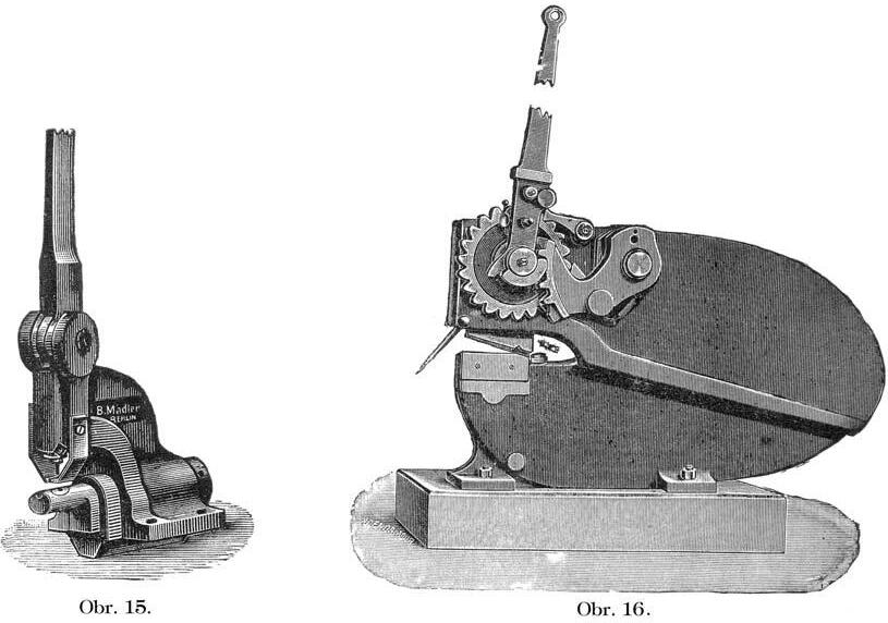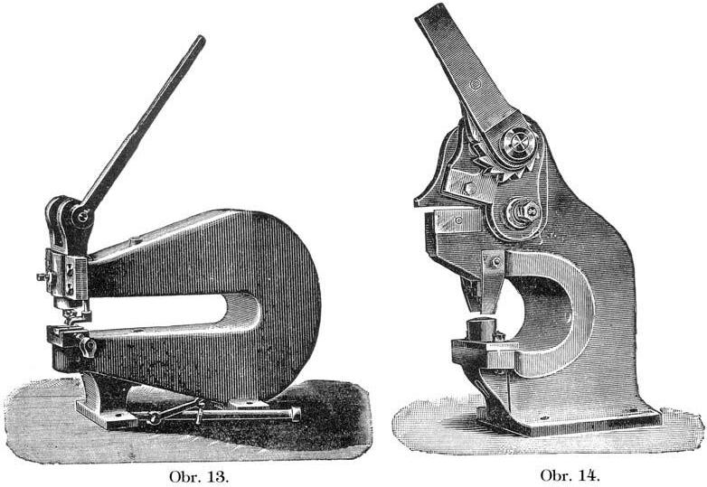 Pákoumožnodlepotřebyotáčetinalibovolnoustranu,čímzlehčujesevelice práce.Děrovadlodruhé(obr.14.)kombinovánojestsnůžkaminaplechaželezo ploché.Výhodnézařízenídovolujeděrovatislabéisilnéželezosestejnousnadnos− tí.Má−liseděrovatinebostříhatislabéželezo,pakpočínámesijakouobyčejných děrovadel;provedemecelouprácinajedenráz.Aleje−liželezopřílišsilné,zapne seozubenékolečkonavýstředníkapákuaprovedeseprácenadvanebotřirázy, přičemžpákazůstanevězetvtommístě,dokteréhojsmejiprvnímtlakem přivedli.