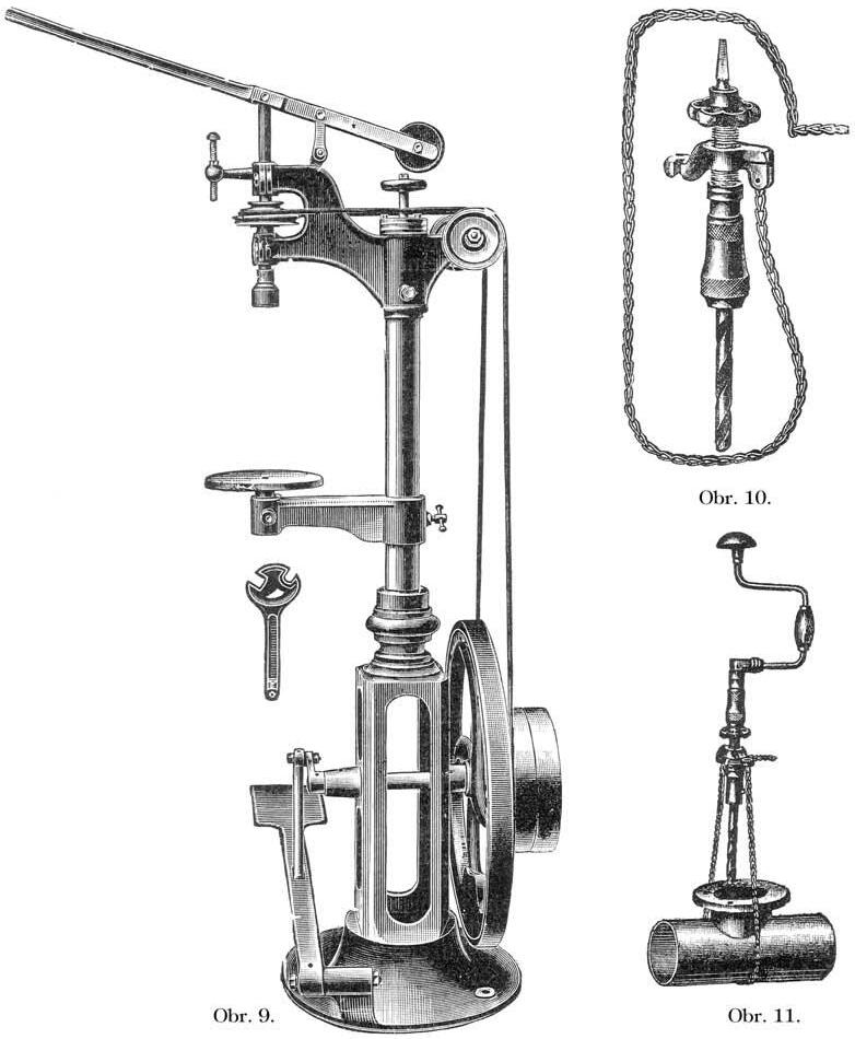 Přiloženýobr.11.sdůstatekvysvětlujeodborníkovijehojednoduchéapraktic− kéužívání.Zejménabudevítanýpřimontáživpřípadech,kdenemožnoužitioby čejnévrtačky.Řetězotočíseokolopředmětuazapnenaprotějšímozubcitak,aby bylconejvícenapjatý;paknasadímekolovrátek,pravourukouotáčíme,anižby chomnanějtlačilialevourukouuvedenýmkolečkemstejnoměrněpřitahujeme. K vrtání možno užiti obyčejných i spirálových vrtáků.