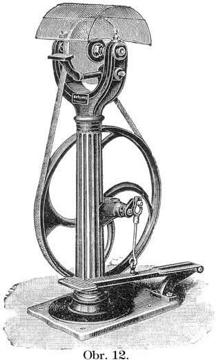 Nahrubšíprácestačíobyčejnýbrusicístrojsvodorovnouosou,najejížobou koncíchpřipevnísepotřebnékotouče.Otáčenídějesešlapánímbuďpřímo,nebře menicíakuželovýmikolečky.Utěchtostrojůužíváseprolehčíchodnejvícekotou čůsolověnýmneblitýmjádremapovrchemsmirkovým.Strojnaobr.12.máhori zontálníosualzehoužitijakkebroušenírovnýchploch,takikuleštěnípomocí kotoučůlátkovýchnebkožípotažených,kdyžosujehoprodloužíme.(Bližšíviz v odd. »Okrašlování kovu«.)