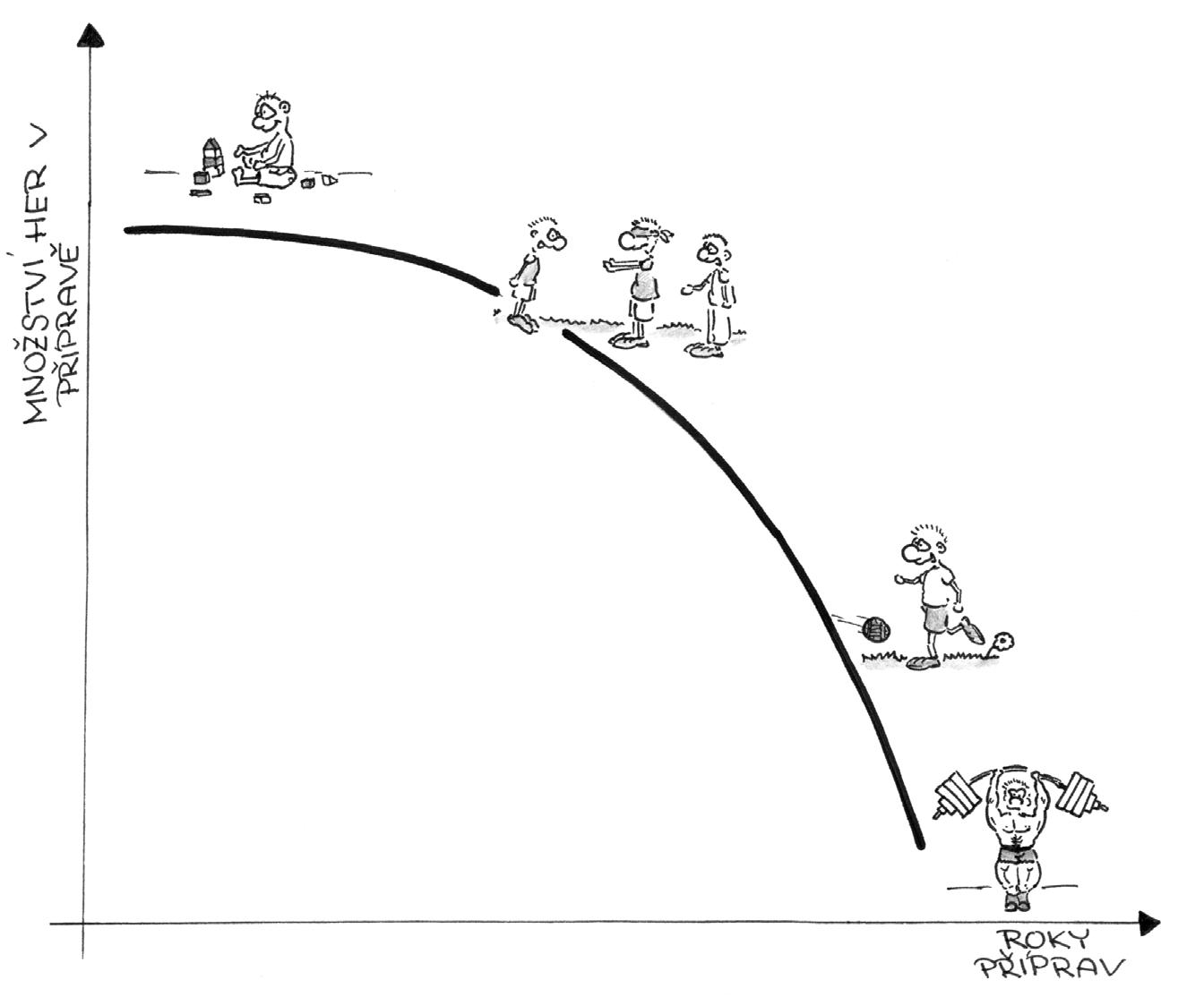 místo i„seriózní“ tréninková činnost, na ní je však dost času vpozdějším věku. Ajejí množství je potřeba přidávat spíše po kapkách. Dřiny si děti užijí ještě dost anení nutné ani žádoucí, aby jim trénink „bral dětství“. Trenér by si měl vždy uvědomovat, že dítě dojde na vrchol jenom tehdy, když vněm vzbudí veliký zájem asvým odhodláním překoná izákonitě přicházející neúspěchy. Zájem ale málokdy vzbudí dril amonotónní dřina. Spíše naopak. Aproto by měl podíl her vtréninku klesat spřibývajícím věkem pomalu (viz obrázek).