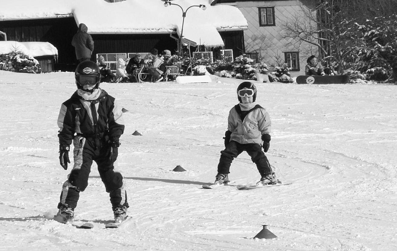 Známý ačastý obrázek při rodinné lyžařské dovolené: otec smatkou na nejnovějších carvingových lyžích voblečení podle poslední lyžařské módy uvolněně alehce točí elegantní oblouky. Jejich jedno nebo několik vlastních dětí na starých, dlouhých, po starším sourozenci zděděných, často ještě plastových lyžích ave zděděném aobnošeném oblečení se snaží svynaložením všech sil rodičům stačit. Platí sice: „Těžko na cvičišti, lehko na bojišti“, ale přece jen, vlastní dítě nemusí být zrovna uvšeho.