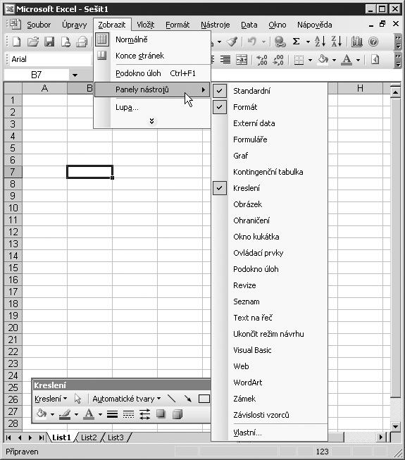Pod panelem nabídek jsou implicitně umístěny panely nástrojů. Ty obsahují nejčastěji používané příkazy v podobě tlačítek. Jaké je jejich uspořádání v jednotlivých aplikacích? Ve výchozím nastavení Excelu jsou pod panelem nabídek ukotveny panely nástrojů Standardní a Formát