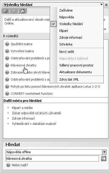 Zkuste si nyní prakticky najít konkrétní informace v nápovědě Excelu. Patříte-li mezi tu skupinu uživatelů, která pracuje častěji s klávesnicí než s myší, oceníte v nápovědě seznam všech dostupných klávesových zkratek v prostředí Excelu. Jak na to? Stiskněte klávesu F1. V podokně úloh (od verze 2003), popřípadě v okně Pomocník (u starších verzí) napište do textového pole pro hledání výstižné slovo, například klávesová zkratka. Výsledkem hledání je seznam témat, která můžete dále rozbalit. Aktivujete-li odkaz „Klávesové zkratky“, zobrazí se v samostatném okně obsah tohoto tématu nápovědy.