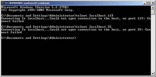 V p ř ípad ě , že služby nejsou doinstalovány, Telnet s nimi na portech 119 (NNTP), resp. 25 (SMTP) nenaváže spojení.